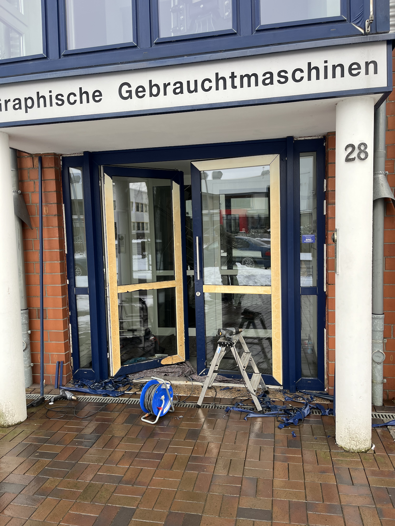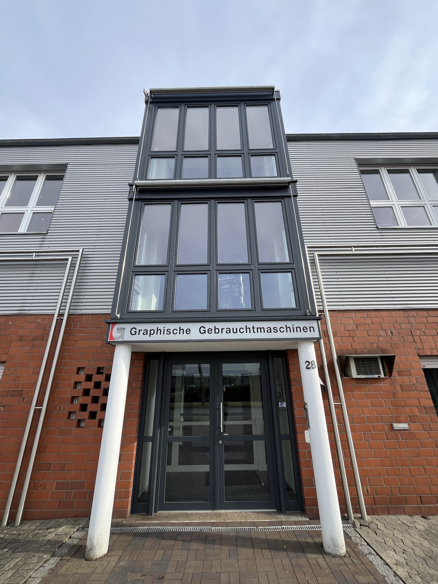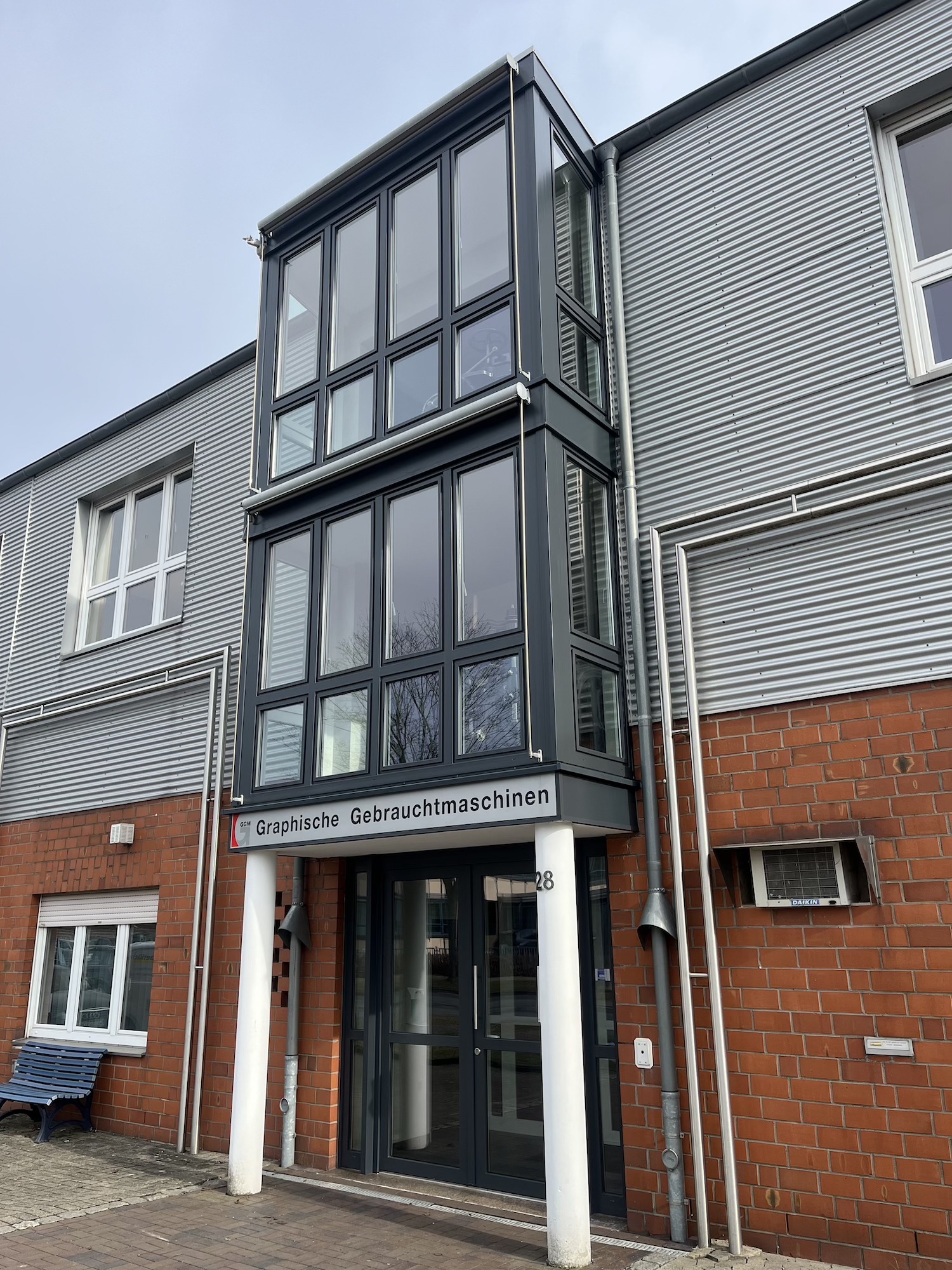 Das bestehende Erscheinungsbild der Firmenzentrale war durch die blau-weißen Fensterrahmen und Paneele optisch in die Jahre gekommen. Besonders bei einem Unternehmen für hochwertige Gebrauchtmaschinen ist der erste Eindruck entscheidend. Ein kompletter Austausch der komplexen Atrium-Konstruktion wäre wirtschaftlich unrentabel und mit enormem Betriebsstillstand verbunden gewesen.